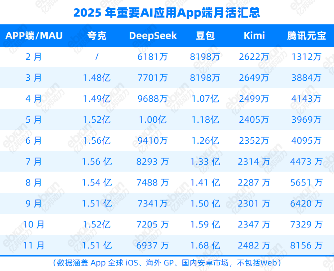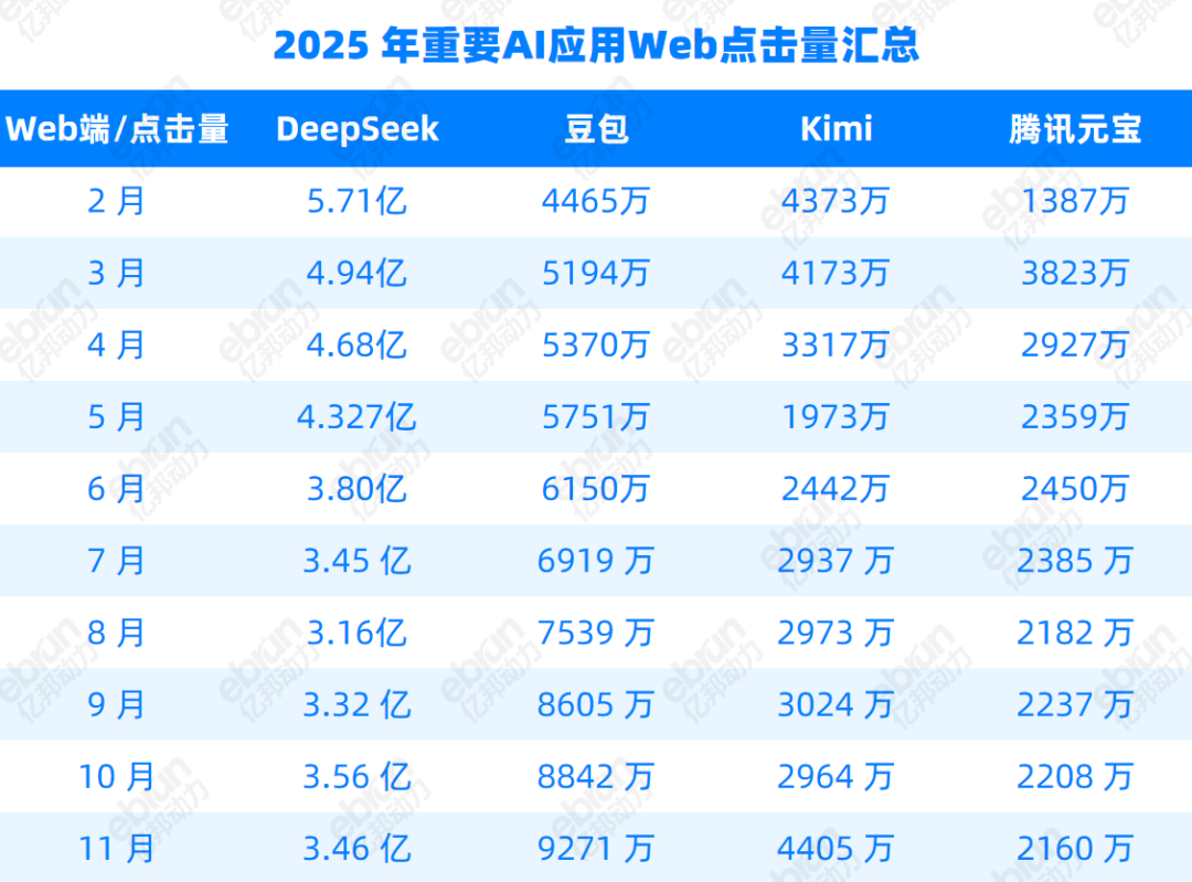 在应用上,到了DeepSeek爆火的2025年,腾讯才推出元宝,比Kimi、豆包晚一年。此后腾讯大举投钱投流量:2025年3月、6月、7月,元宝投放金额均破10亿元,4月、5月则稳定在7亿元上下,同时借助微信生态获得可观用户。但目前,元宝依然主要作为“AI好友”存在。