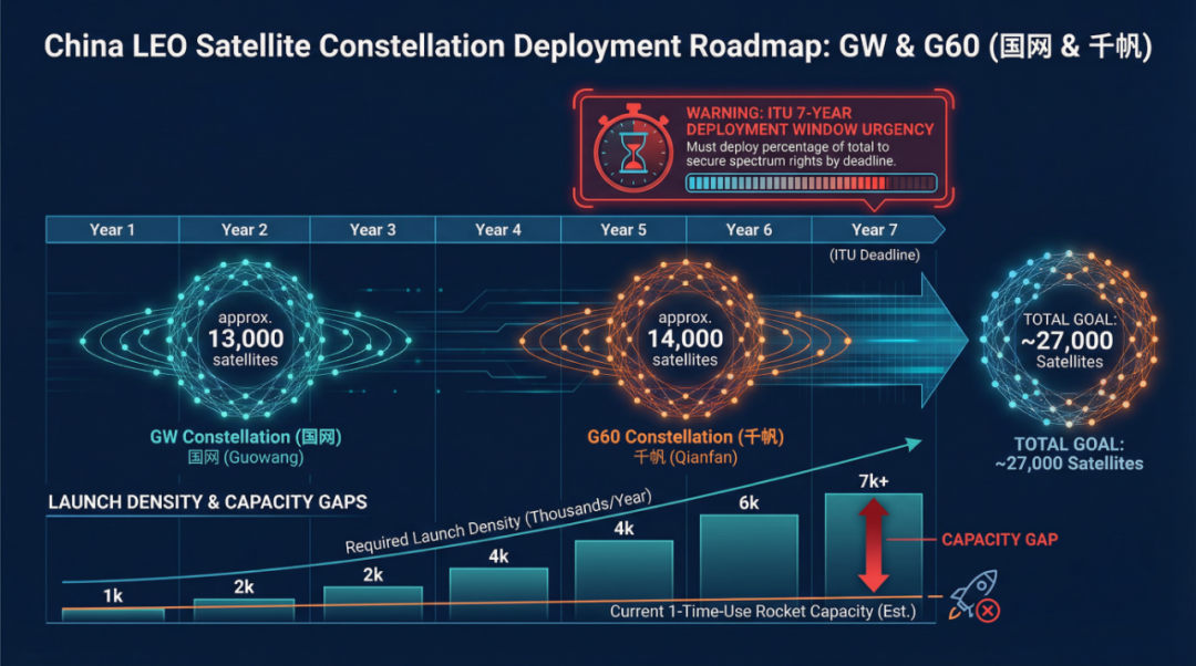 卫星星座部署路线图,显示GW星座13000颗,G60星座14000颗,共27000颗,ITU 7年部署窗口紧迫性