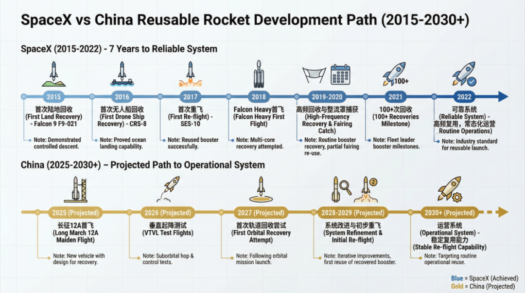 时间线对比显示SpaceX 2015-2022年的火箭发展与中国长征12A计划2025-2030年的关键里程碑