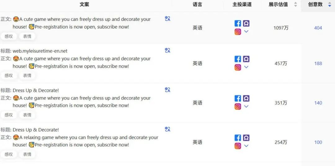 基于其定位和受众群体,「我的休闲时光」在营销策略上也下了功夫。广大大显示,游戏在12月初进行了一波力度很大的投放,主要渠道是用户量庞大的Facebook和旗下平台。这一批投放的重点除了展示玩法之外,还在积极鼓励玩家预注册,游戏Facebook主页的消息显示,在正式上线前游戏预注册用户总量至少达到了100万人,这无疑对游戏上线当日的下载量有重大拉动作用。