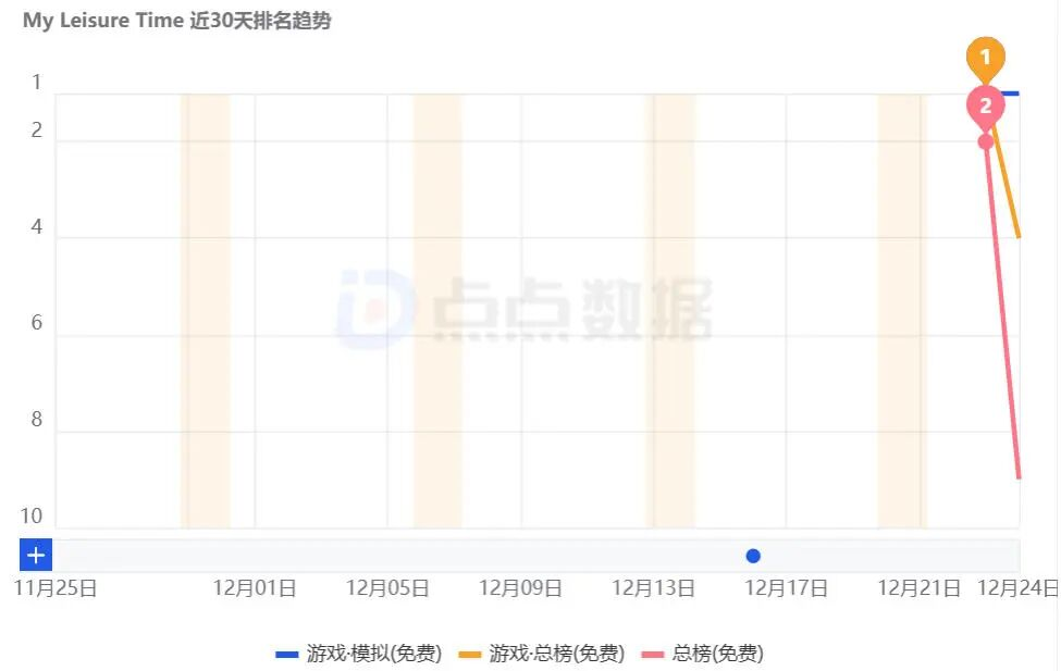 但就在2025年就要过去的时候,一款名为「My Leisure Time(中文名“我的休闲时光”)」的出海新品打破了僵局。同样是模拟经营的玩法,但正式上线首日就登顶美国iOS手游下载榜,在iOS总榜也跻身Top 2。它做对了什么?