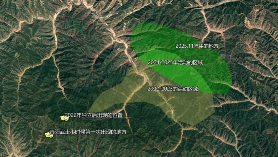 2023年,昔阳武士开始频频出现在很大范围内的红外相机前。它从出生地出发,向东越过豹乡田,穿越公路来到集装箱基地的山上,然后继续向东北方向进发,并开始出现在昔阳县境内。