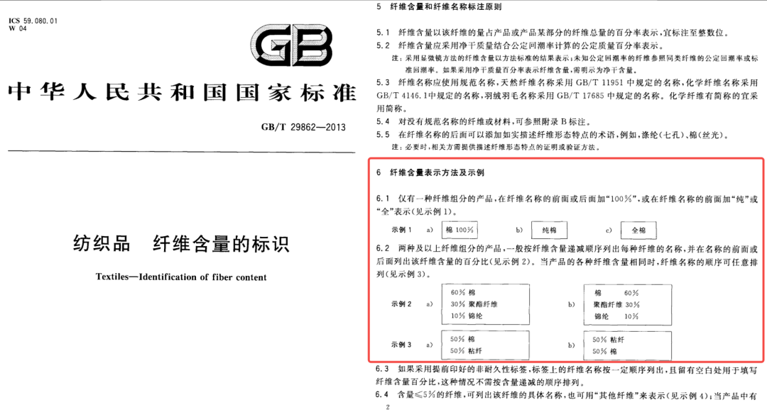根据国标,面料成分或者说纤维成分的固定格式为:占比百分比 + 纤维名称。