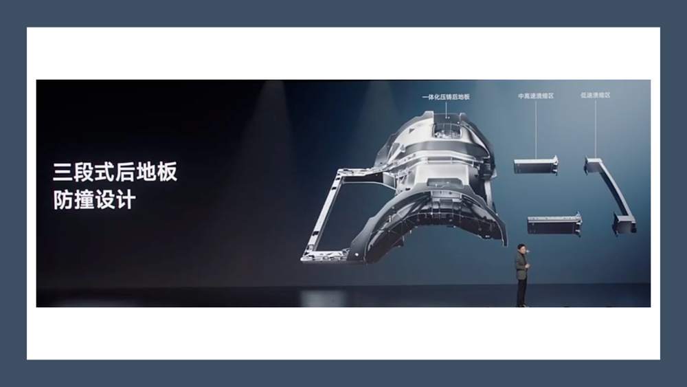 像小米还专门给后地板这个压铸件,做了三段式防撞设计,就是为了能实现在一般的中低速碰撞中,只更换防撞梁和溃缩区,不更换后地板。