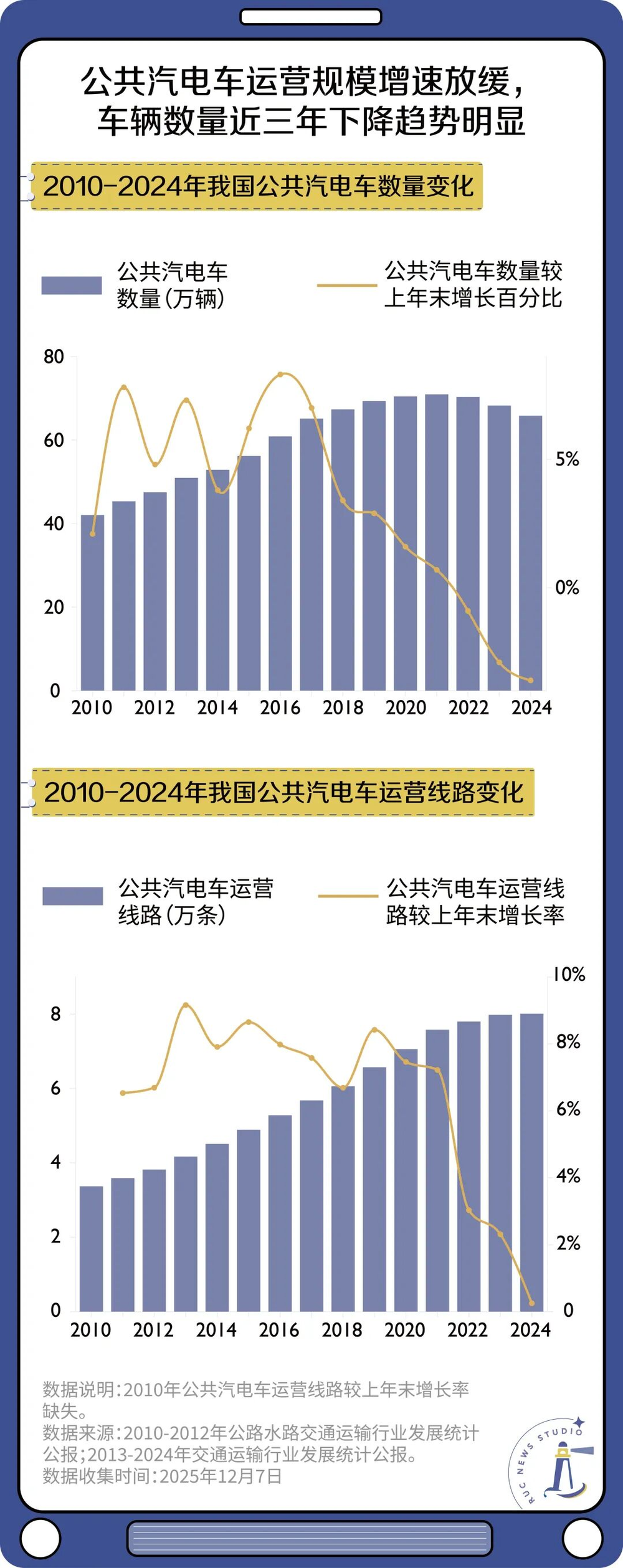 此外,在公共汽车数量和运营线路上也能明显观察到“瘦身”的趋势。2010—2024年间,我国公共汽电车数量经历由上升到缓慢下降的过程,公交数量在2021年前后达到峰值。这一方面是因为公交车数量的需求在不断降低,另一方面,在常规的、使用年限到达上限导致车辆报废外,多地公交公司选择以旧车养护取代购入新车,使车辆总数上升速度趋缓乃至下降。