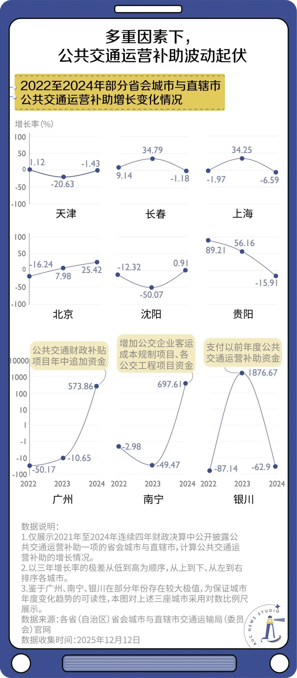 但从多地财政决算的数据来看,补贴并非一条持续上扬的直线。2022年至2024年间,多个省会城市和直辖市的公共交通运营补贴增速起伏不定,常随着运营成本核算、项目调整与年度预算安排发生变化。另有报道指出,部分地区因财政吃紧,存在补贴不及时、不到位的情况[13]。