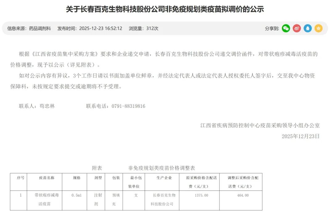 12月23日,江西省疾控中心发布《关于长春百克生物科技股份公司非免疫规划类疫苗拟调价的公示》,百克生物(SH688276,股价19.19元,市值79.38亿元)的带状疱疹减毒活疫苗,采购价(含配送费)从1375元/支降至464元/支,降幅约66%。