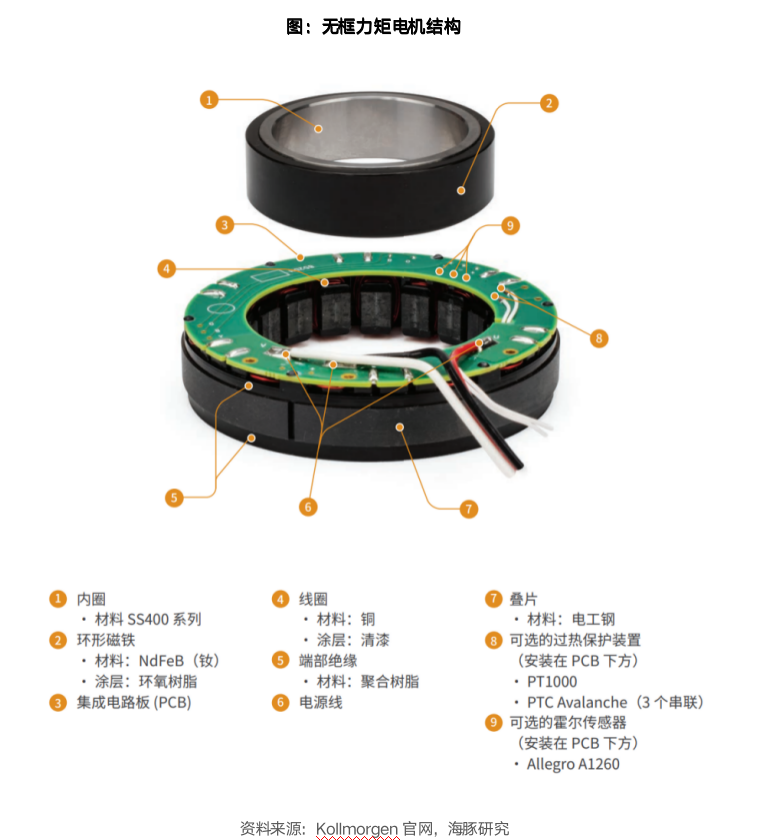 其中,转子由环形磁铁和钢圈组成,可以直接跟关节的主轴集成在一起,定子由叠片和铜线圈等部件组成,可以直接与机器的外壳结合在一起。