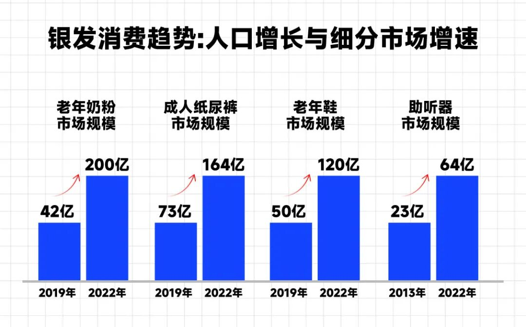 报告提醒,在过去的2019-2022年,这段很多行业都举步维艰的时间里,很多面向“银发族”的细分领域,都依然出现了高速增长。