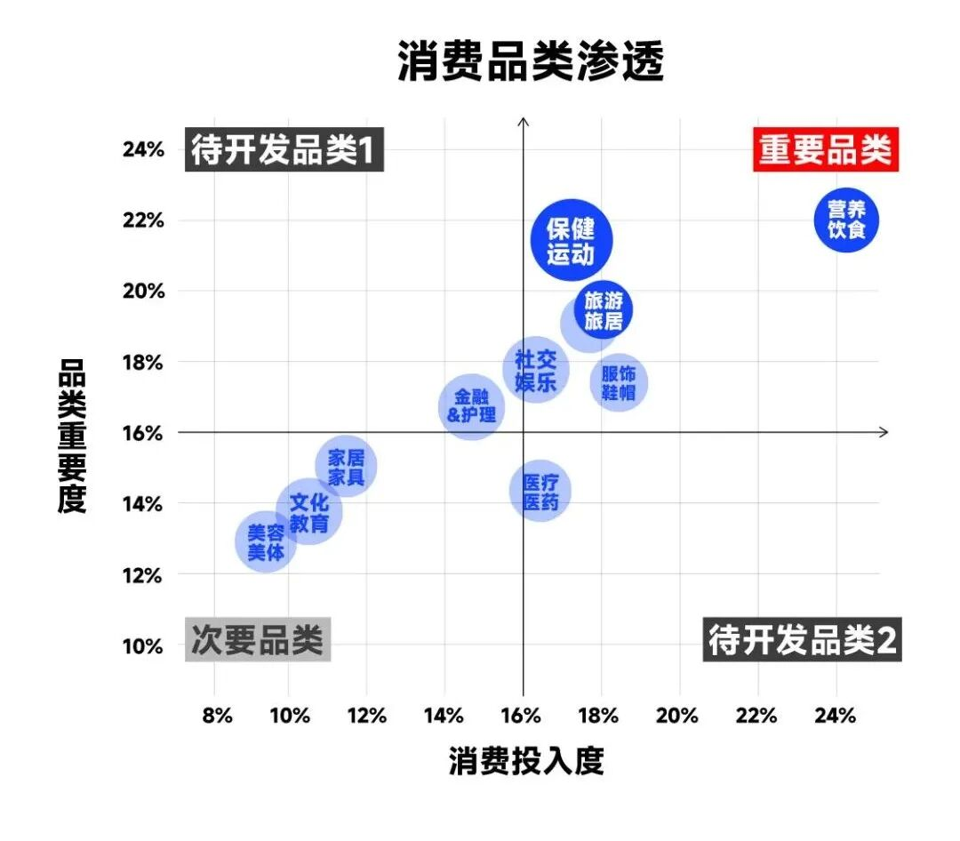 《银发报告》的调研,基于“品类重要度”和“消费投入度”2个维度,集中梳理了一组常见的消费品类。