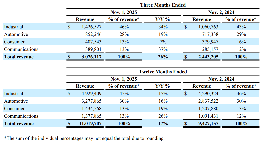 2025财年ADI的所有应用市场都实现了两位数增长。公司在最近的财报电话会议上说明了主要应用市场的表现: