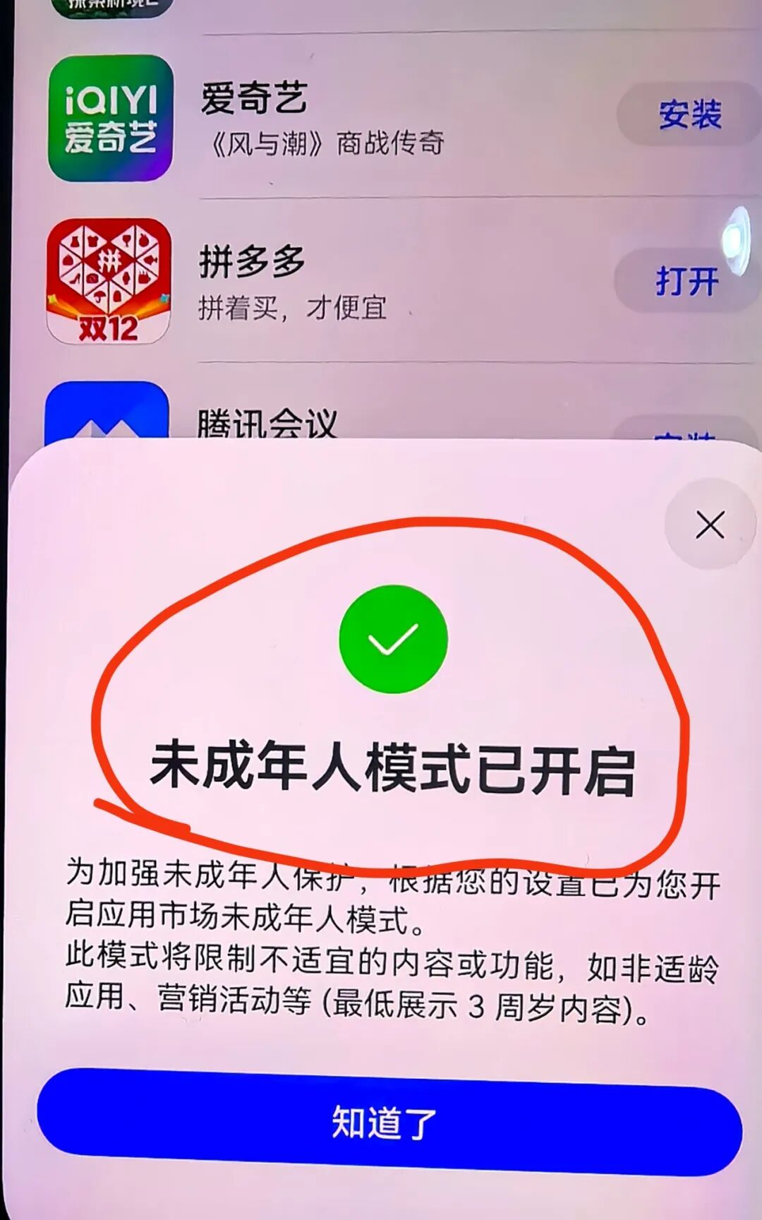 以华为应用市场为例,打开时弹窗提示显示“未成年人模式已开启,此模式将限制不适宜的内容和功能”,内容方面只展示与账号年龄相符的应用;功能方面会隐藏营销活动、心愿单等功能;对于不适龄的应用,也不可点击“安装”。“鸿蒙有礼”属于营销活动,涉及红包金额,并不适合未成年人参与,因此,孙先生在使用未成年人账号参与时会受到限制。