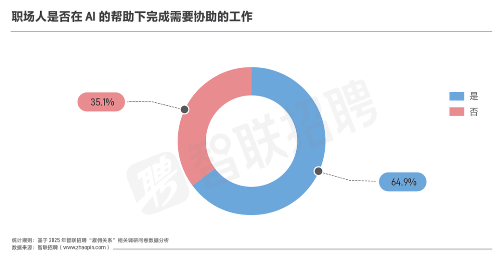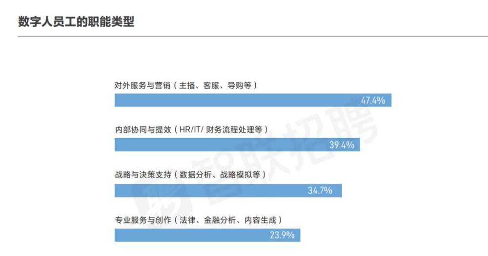 眼下,整个职场的确在经历AI替代的“阵痛”。智联招聘最近发布的《2025雇佣关系趋势报告》揭示,10.3%的职场人所在企业已正式部署“数字员工”,47.4%用于面向客户的高频交互场景,如直播导购、智能客服、虚拟助手;39.4%承担HR、财务、法务等中后台流程自动化任务;超三成甚至能够涉猎数据分析与战略模拟等高阶领域。