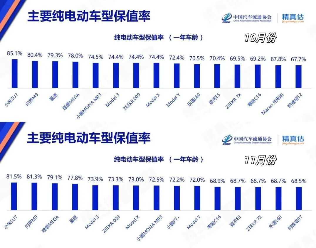 问界M9纯电版的保值率从10月份的80.4%上升至81.3%,与排名第一的小米SU7仅相差0.2个百分点,理想MEGA则从78.0%上升至79.1%。