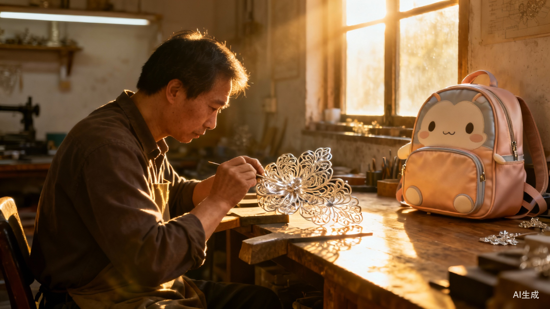 “每根银线都要经过拉丝、退火、掐丝,蝴蝶翅膀的卷丝部分,师傅要先画手稿,再一点点编合,光这一步就要三天。”子羽古法工坊抖音电商运营负责人严建力告诉五环外,工坊里的每件作品都做了登记证书,从设计到成品,至少经过12道工序,就连表面的镀金和防氧化处理,都比同行多两道工艺。为了让技艺传承下去,他们还和番禺的技术学校合作,让年轻学徒跟着老匠人学手艺,老派技法与年轻审美碰撞出更多火花。