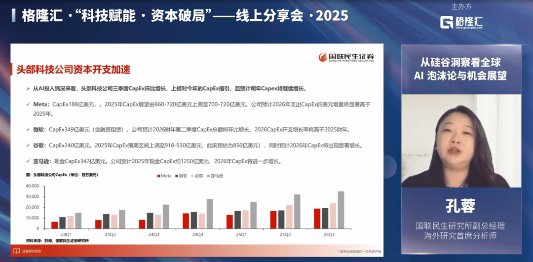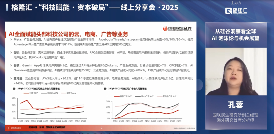 近日,在格隆汇举办的“科技赋能·资本破局”分享会上,国联民生研究所副总经理兼海外研究首席分析师孔蓉围绕全球AI发展趋势、关键技术演进与市场机会等进行了深度分享。
