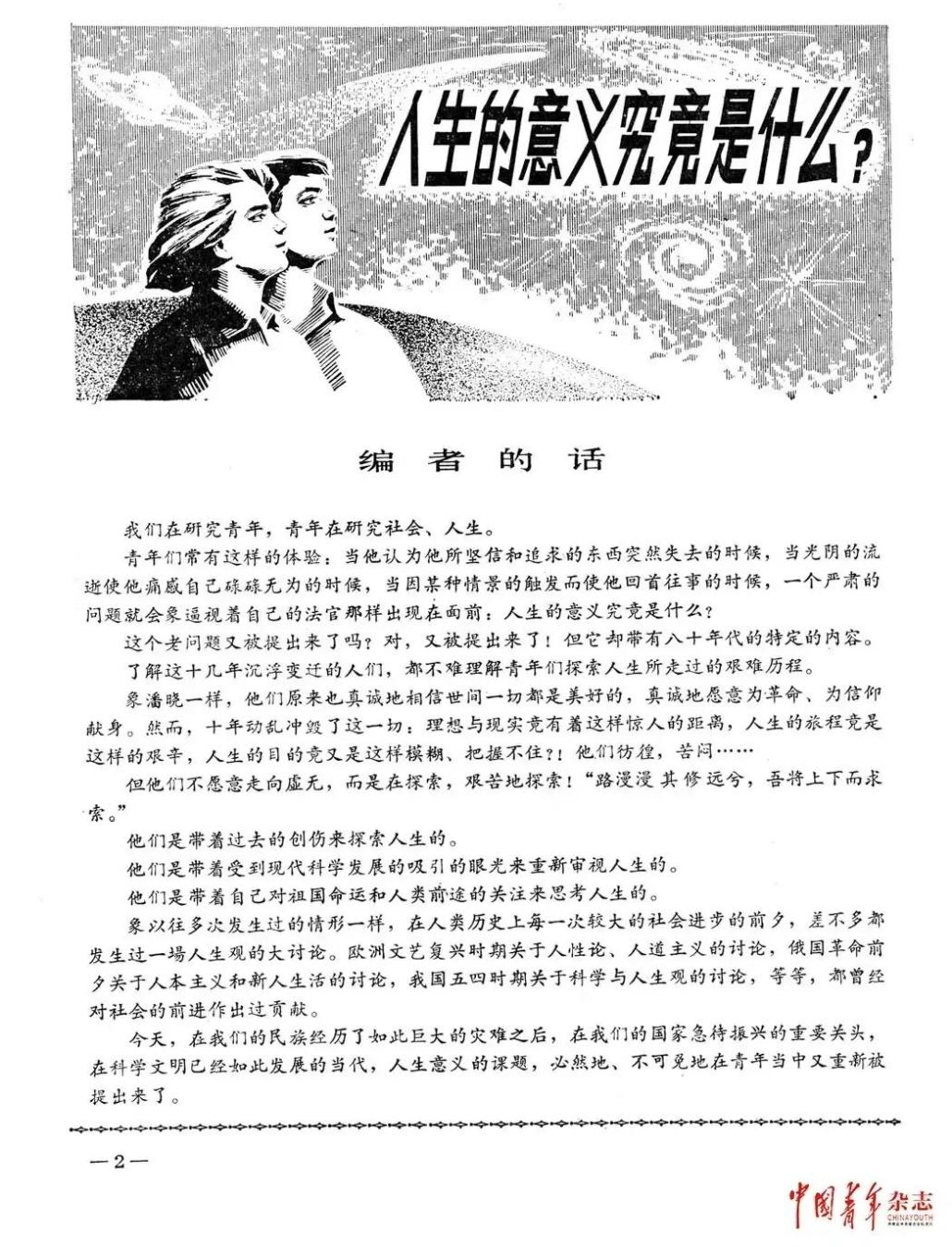 《中国青年报》对这封信的编者按中有这样一句话,“青年们常有这样的体验:当他认为他所坚信和追求的东西突然失去的时候,当光阴的流逝使他痛感自己碌碌无为的时候,当因某种情景的触发而使他回首往事的时候,一个严肃的问题就会像逼视着自己的法官那样出现在面前:人生的意义究竟是什么?”