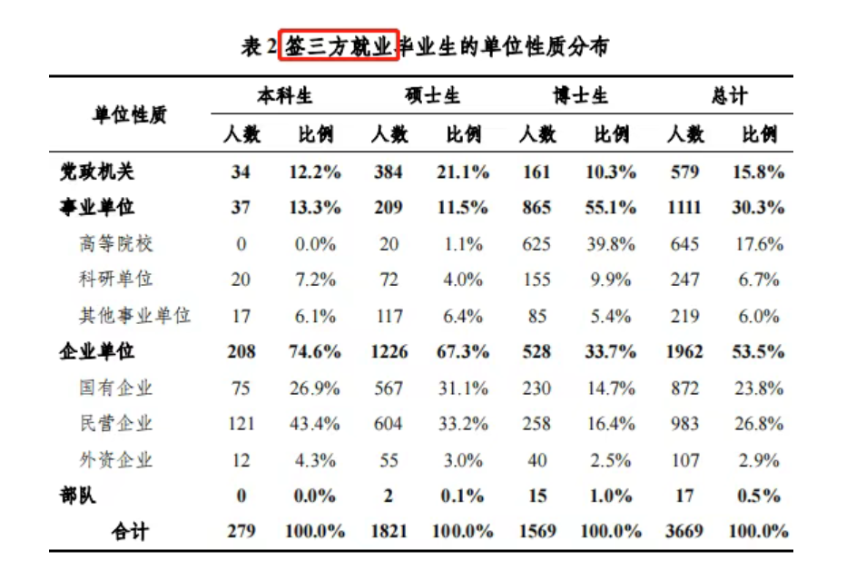 此外,对“稳定”的追求正在成为年轻人们择业的主要考量因素。报告显示,认为“稳定最重要”的应届毕业生为51%,较去年增长了10%。实际上,这种求稳的择业趋势在2021年就已初现端倪:清华大学发布的《2021年毕业生就业质量报告》中提及,签三方就业人数总计3669人,去往党政机关、事业单位、国有企业的占比分别为15.8%、30.3%、23.8%,总计69.9%。