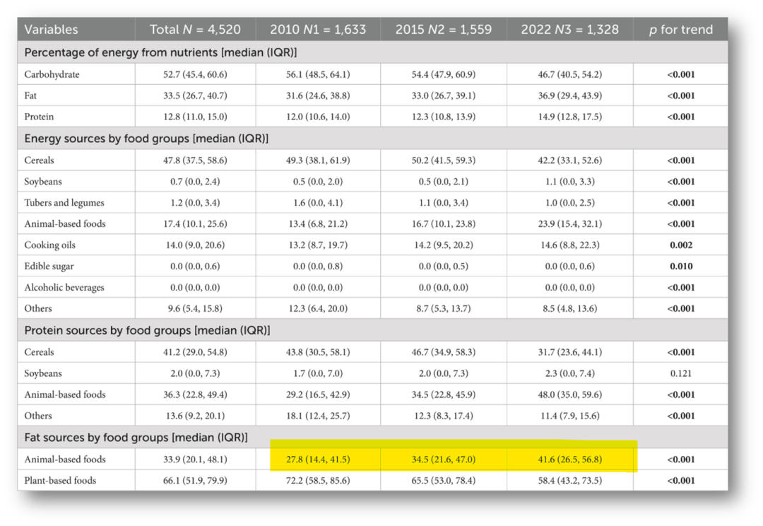 今年6月发表的一篇北京居民饮食结构调查,显示从2010-2022,脂肪摄入从31.6%上升到36.9%,其中动物油脂占比从27.8%上升到41.6%: