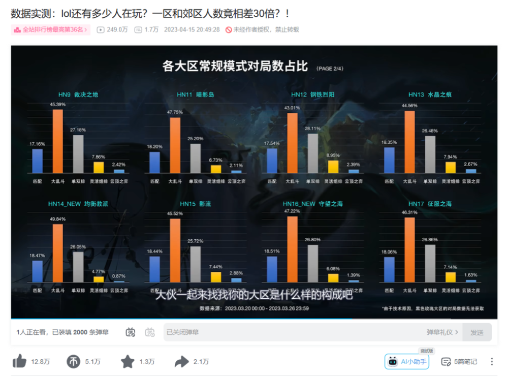 早在23年,B站UP主“布锅锅”就根据《英雄联盟》游戏对局回放文件的专属ID,成功统计出了《英雄联盟》国服客户端内为期一周的游戏对局。据统计结果显示,近乎一半的对局都是“极地大乱斗”模式,足见隐藏在主流之外的娱乐玩家规模之大。