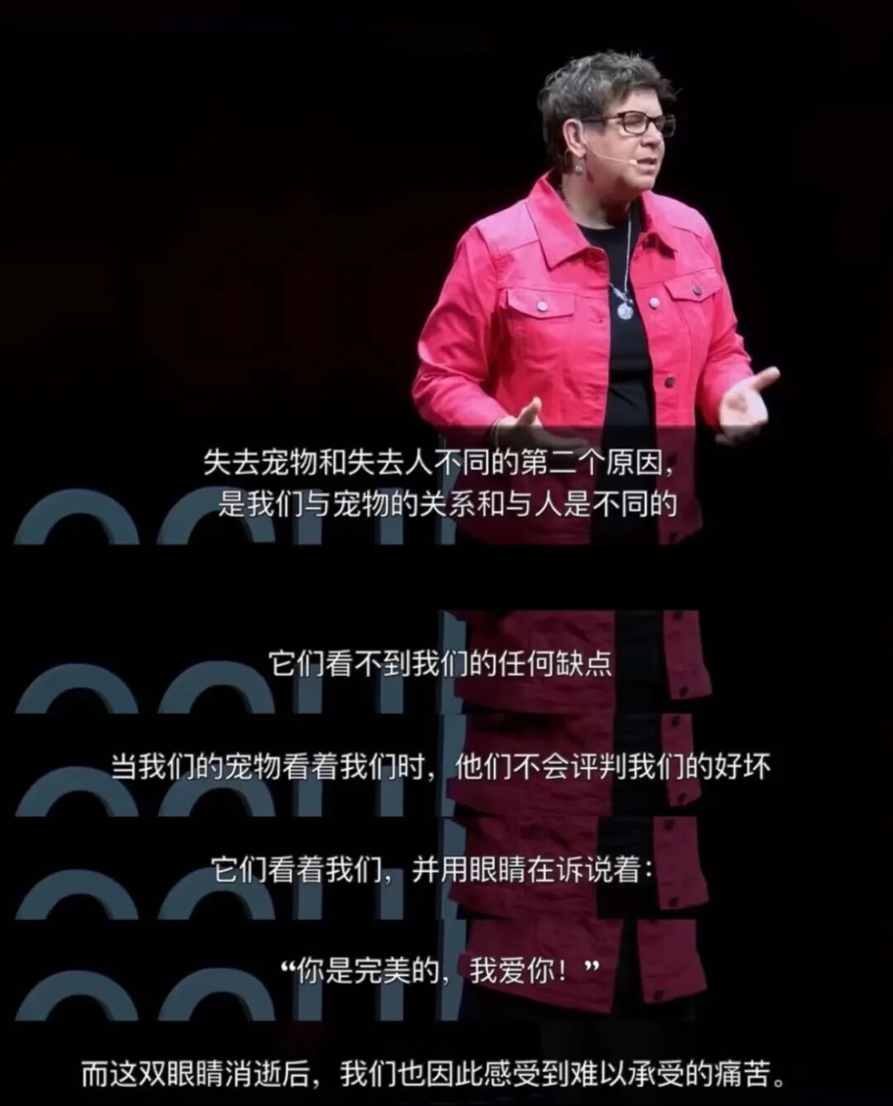 长期从事急救的兽医 Hoggan 在 TED 的演讲中曾指出:失去宠物的痛不同于失去某个人,就在于我们与宠物的关系是如此不同,它们看不到我们的任何缺点,当我们的宠物看着我们时,不会评价我们的好坏。它们看着我们,并用眼睛在诉说着,“你是完美的,我爱你!”,而那双眼睛消失时,我们也因此感到难以承受的痛苦。