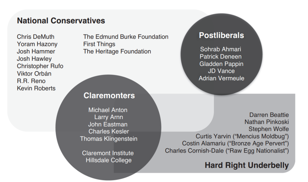 新右翼的确存在共同的核心特征,但并非铁板一块。本书将新右翼划分为三大阵营:克莱蒙特学派(Claremonters)、后自由主义者(Postliberals)和国家保守主义者(National Conservatives)。简言之,克莱蒙特学派崇拜美国建国精神,后自由主义者推崇特定的(由宗教启发的)"共同善"理念,国家保守主义者则信奉传统美国民族的神话。这些阵营并非互斥;最好将新右翼视为一个包含许多独特集群与思维模式的高度互联运动,不但汇聚知识分子,更包含活动家、意见领袖、幕僚及政客。