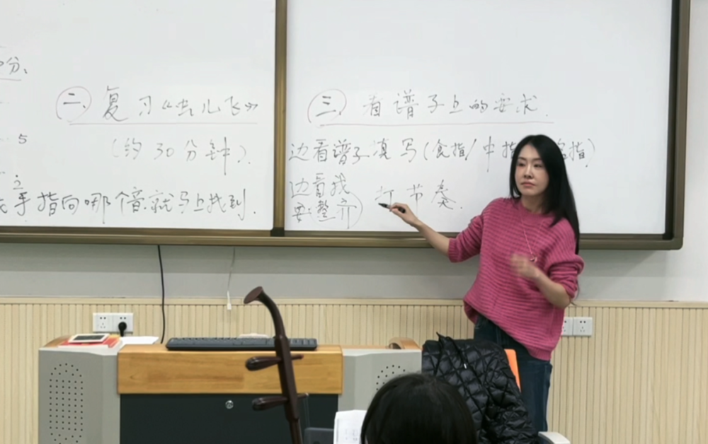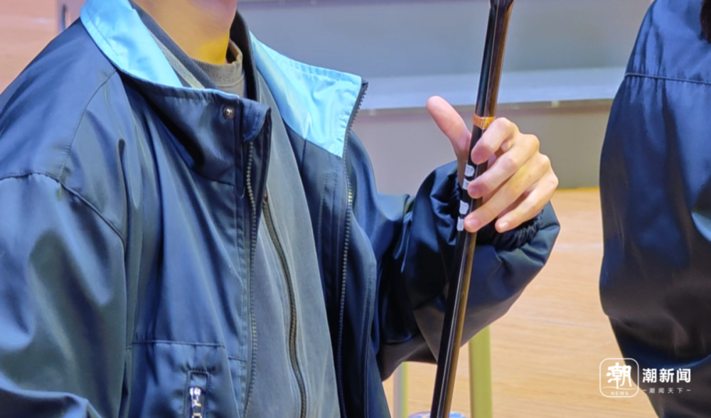 比如,二胡的琴杆上用白色胶带贴出了一指、二指、三指、四指的具体位置,方便学生们记忆。