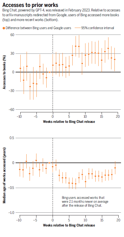 人们常担心AI会带来“信息茧房”,让我们只关注那些热门的、头部的文献。但通过分析Bing Chat(集成GPT-4)用户的引用行为,研究者发现了相反的趋势。