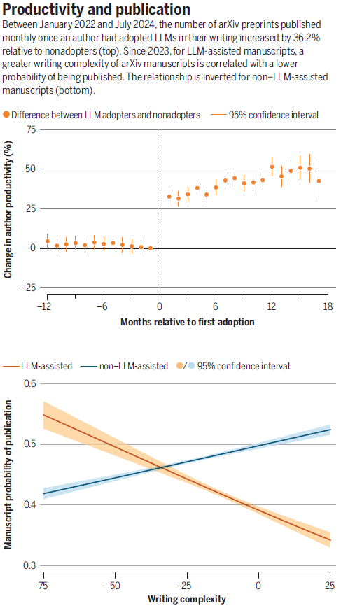 2025年12月,一篇发表在Science上的政策分析文章给出了迄今为止最系统的实证答案。来自康奈尔大学和加州大学伯克利分校的研究团队分析了超过210万篇预印本论文,揭示了大语言模型对科学生产的深远影响:它提升了生产力、降低了语言门槛、拓宽了知识发现的边界——但也正在瓦解我们用于判断研究质量的传统信号(Kusumeg et al.,2025)。