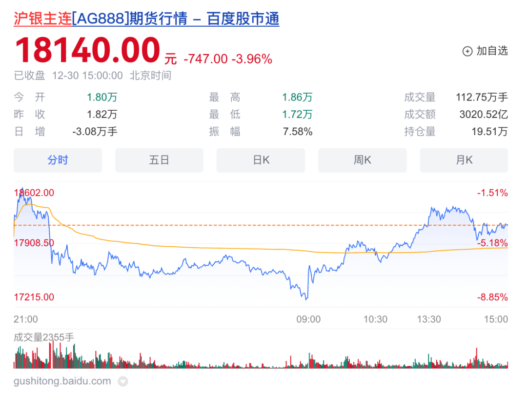 11月下旬以来,国内银价大涨。沪银主连数据显示,白银价格一路从每千克1.2万元上涨至1.8万元,涨幅高达50%。虽然银价在12月29日出现显著回调,但截至当晚11点,沪银主连仍然维持在每千克1.7万元以上。截至发稿,沪银主连涨到每千克1.8万元以上