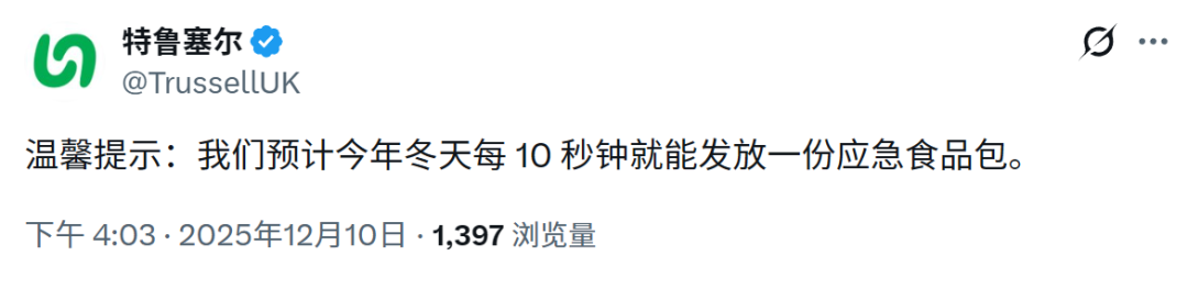 为应对这种极端贫困状况,英国出现了大量食物援助机构,其中最常见的是“食物银行”,为吃不上饭的人提供几天的应急口粮。仅英国最大的食物银行 Trussell Trust 一家,在 2024~2025 财年就分发了超过 290 万次紧急食物包,平均每 11 秒发出一次,其中超过 100 万份给了儿童。