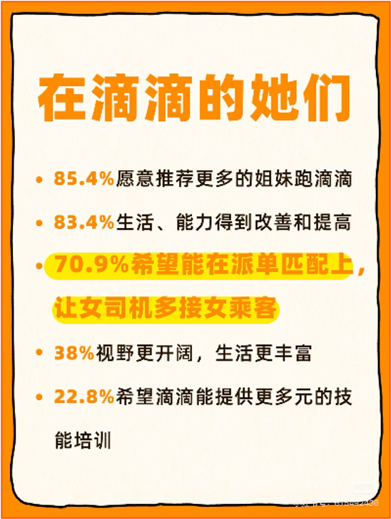 滴滴的调研显示,使用该功能的女乘客比其他乘客的满意度高21%,女司机接该类订单的满意度高12%、接单意愿上升17%、安全感提升14%。