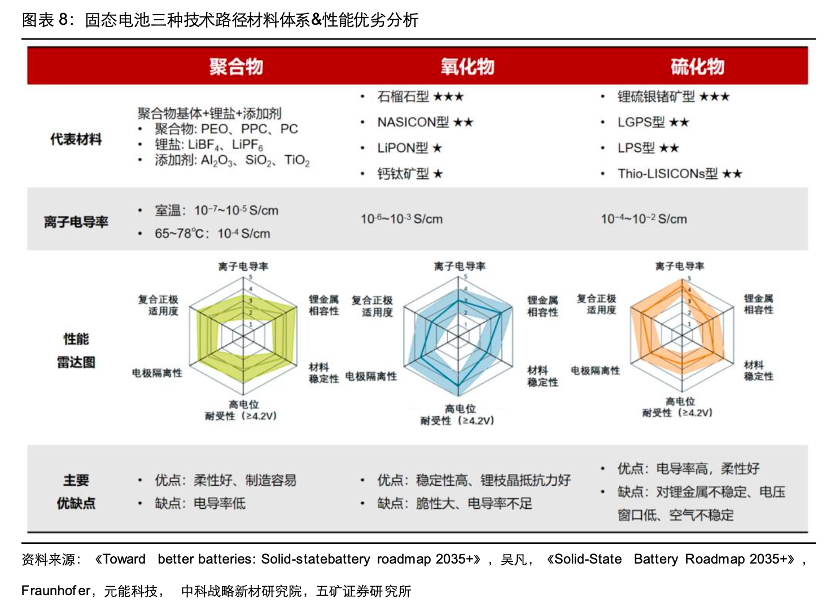 招商期货一份研报指出,硫化物固态电解质核心优势是其接近液态电解液水平的室温离子电导率,远好于氧化物、聚合物。且硫化物具有优异的机械性能,其质地类似“橡皮泥”,可通过冷压成型制成致密电解质层,更好解决全固态电池固-固界面问题。硫化物具有较宽的电化学窗口,适配高压正极材料,能适用500Wh/kg以上高能量密度的电池设计。