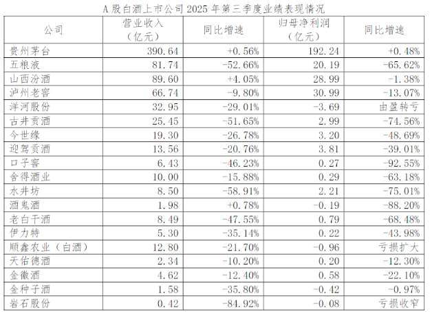2025年三季度,白酒行业交出了惨淡的成绩单。除贵州茅台、山西汾酒等极少数公司维持微增外,绝大多数酒企业绩大幅下滑,部分企业净利润跌幅超过90%。其中五粮液第三季度营收同比降52.66%;古井贡酒、口子窖、水井坊等区域酒企单季净利润降幅超70%。行业陷入前所未有的调整期。
