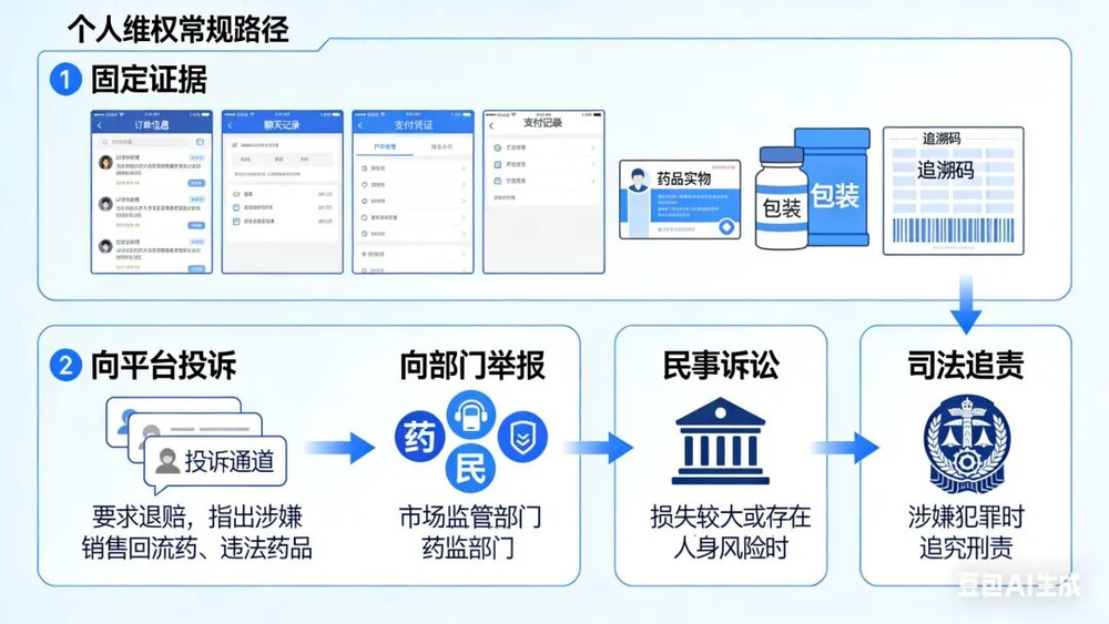网购回流药维权路径。图片来源:根据汤建彬介绍制图