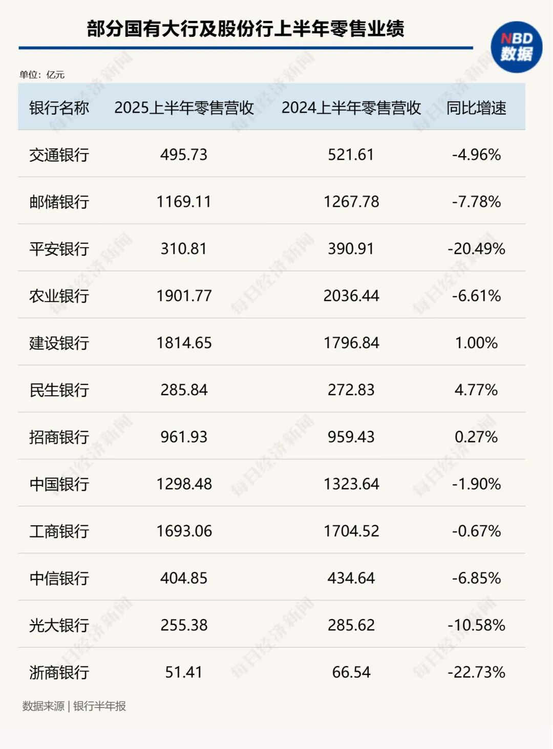 记者梳理了部分主要银行零售业务数据,可以看到的是,今年上半年零售业务整体增长态势疲软,不少国有大行、股份行零售业务收入和利润同比出现不同程度下降,在总营收和利润中的占比也有不同程度下降。