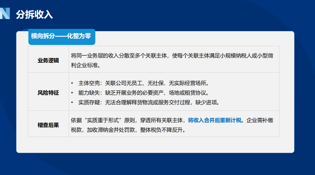 比如原来一个主体一年1000万收入,现在拆成三四个主体,每个都控制在某个门槛以内,看上去每个公司都“符合优惠条件”,这也是最典型的一类。