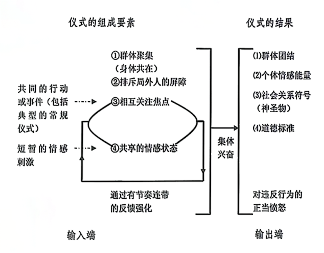 根据美国社会学家兰德尔·柯林斯的《互动仪式链》,仪式由身体共在、排斥局外人的屏障、相互关注焦点和共享的情感状态组成。