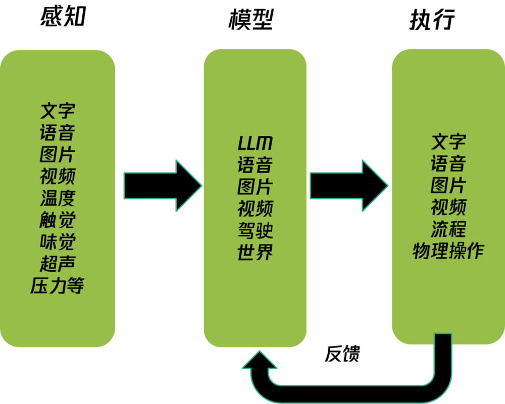 终极感知:AI的感知将不仅限于文字、语音、图片、视频,还将扩展到物理世界,通过温度、触觉、味觉、压力等传感器获取全方位数据,经各类模型处理,再反馈到数字或物理世界。