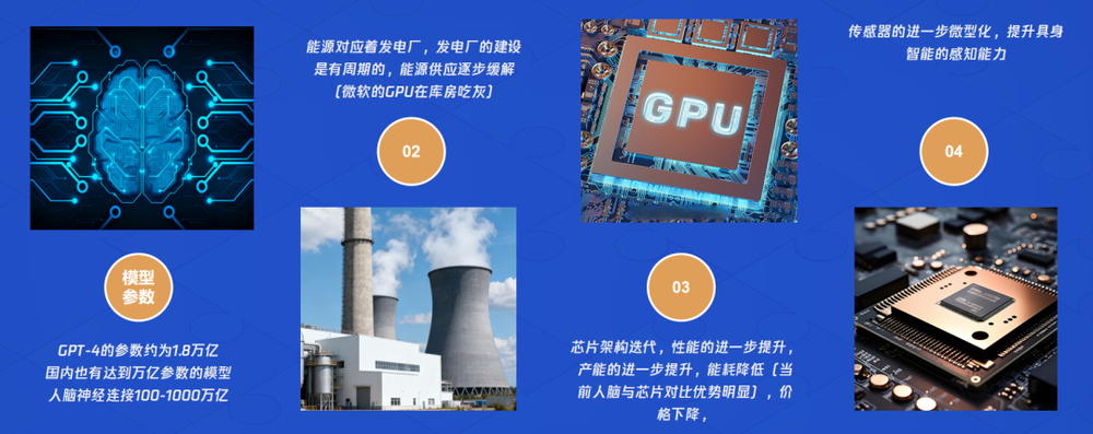 芯片性能:需持续提升算力、产能,并大幅降低能耗(当前AI芯片能耗远高于人脑)。