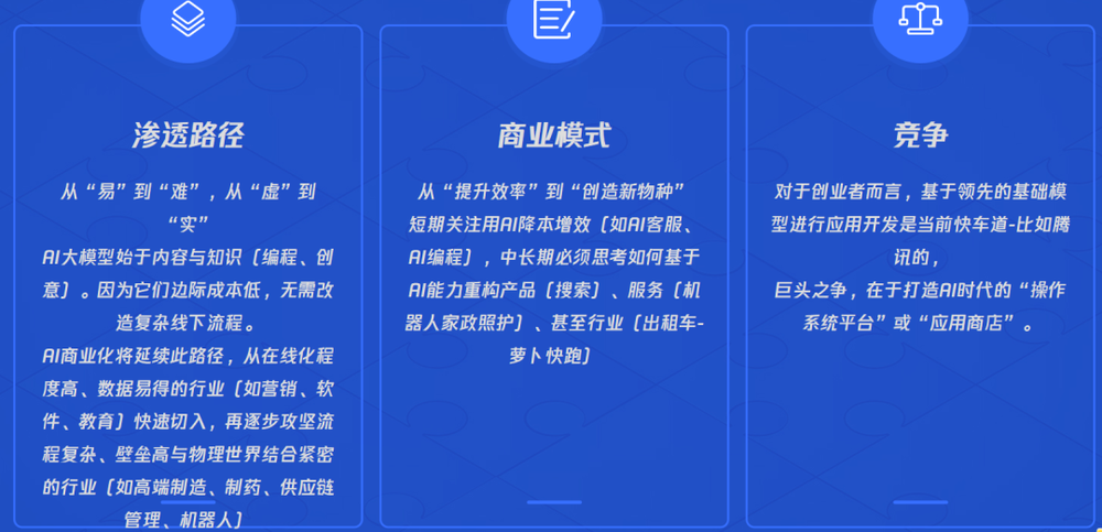 AI大模型:核心是处理知识与内容。当前已从编程、创意等领域切入,正向着工作流优化、产品形态创新发展,未来必将与各产业深度融合,并进一步与物理世界结合。