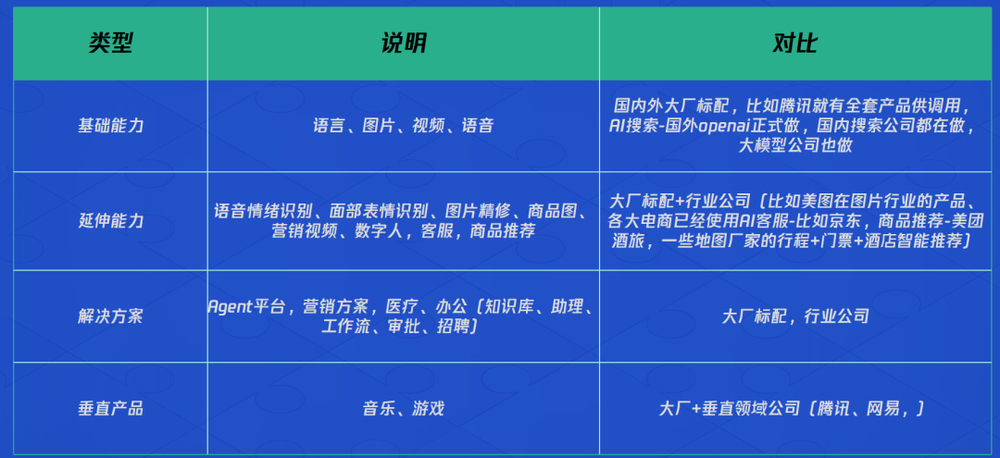 基础能力(语言、图片、视频、语音):已成为国内外大厂及科技巨头的标配。