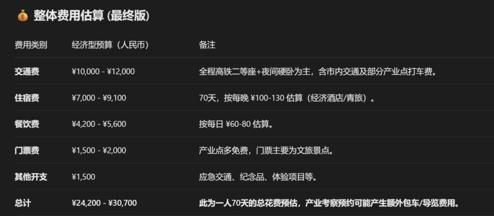 规划细节:要求每日行程具有足够的颗粒度,并最终提供费用预算。