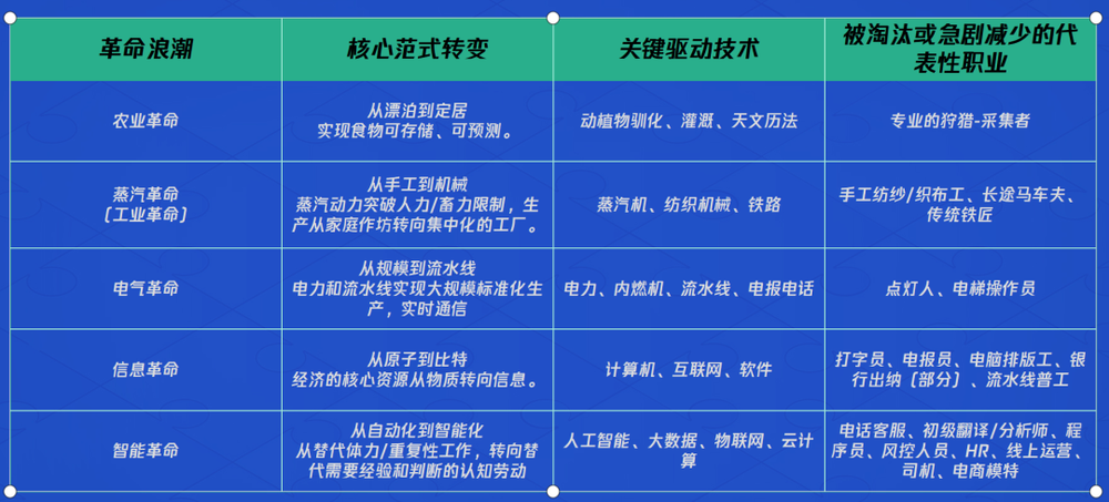 技术革命总会重塑就业结构。智能革命的特点是从自动化走向智能化,从替代体力劳动转向替代需要经验和判断的认知劳动。一些岗位已受到影响: