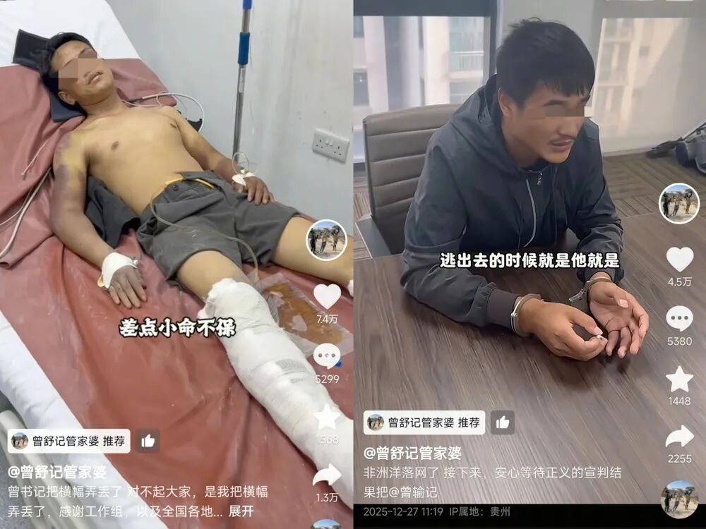 2025年12月,曾凡贵发布的两条视频截图,左为曾凡贵被送医的画面,右为赵某洋落网视频。