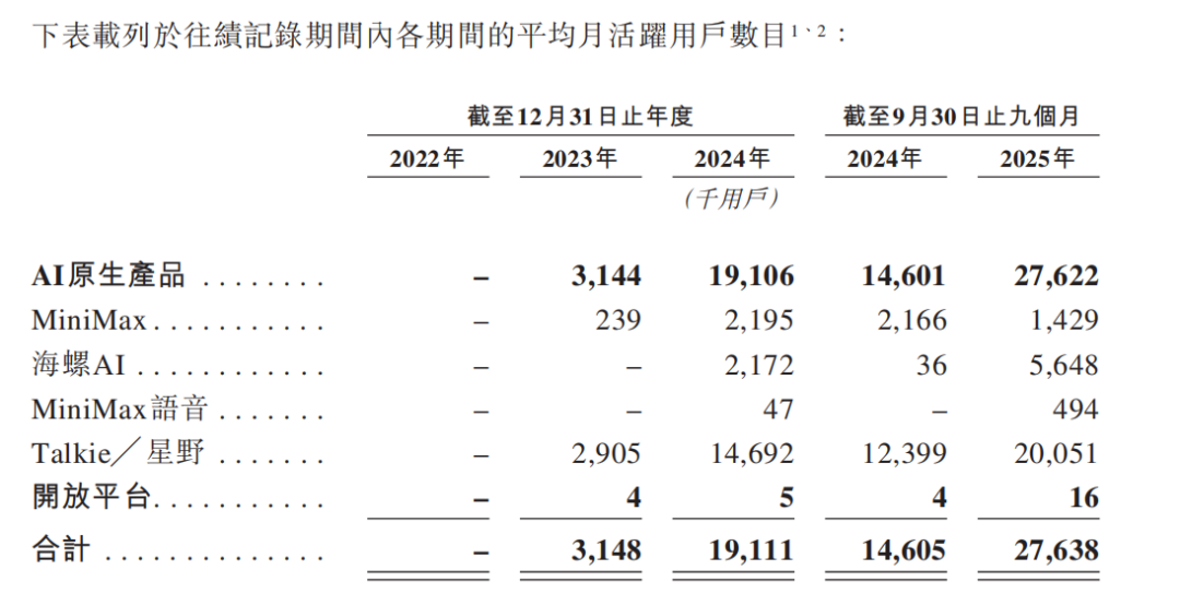 基于C端为主的商业布局,在MiniMax的招股书中,用户量与月活等经营数据是其披露的重点,MiniMax的AI原生产品在2023年的平均MAU约为315万,到2024年实现超六倍增长,达到1911万。截至2025年9月30日,MiniMax拥有2.12亿名个人用户,月活已达2760万。