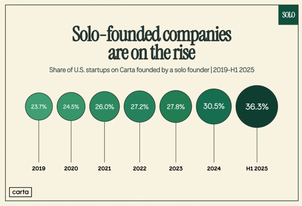 从2019年的23.7%到2025年上半年的36.3%,独立创始人创立公司的比例在六年间增长了53%。