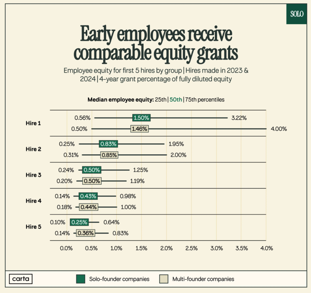 数据也支持这一观点,solofounders的研究显示,独立创始人公司对早期员工(前5名)给予的股权激励中位数与联合创始人公司非常接近。