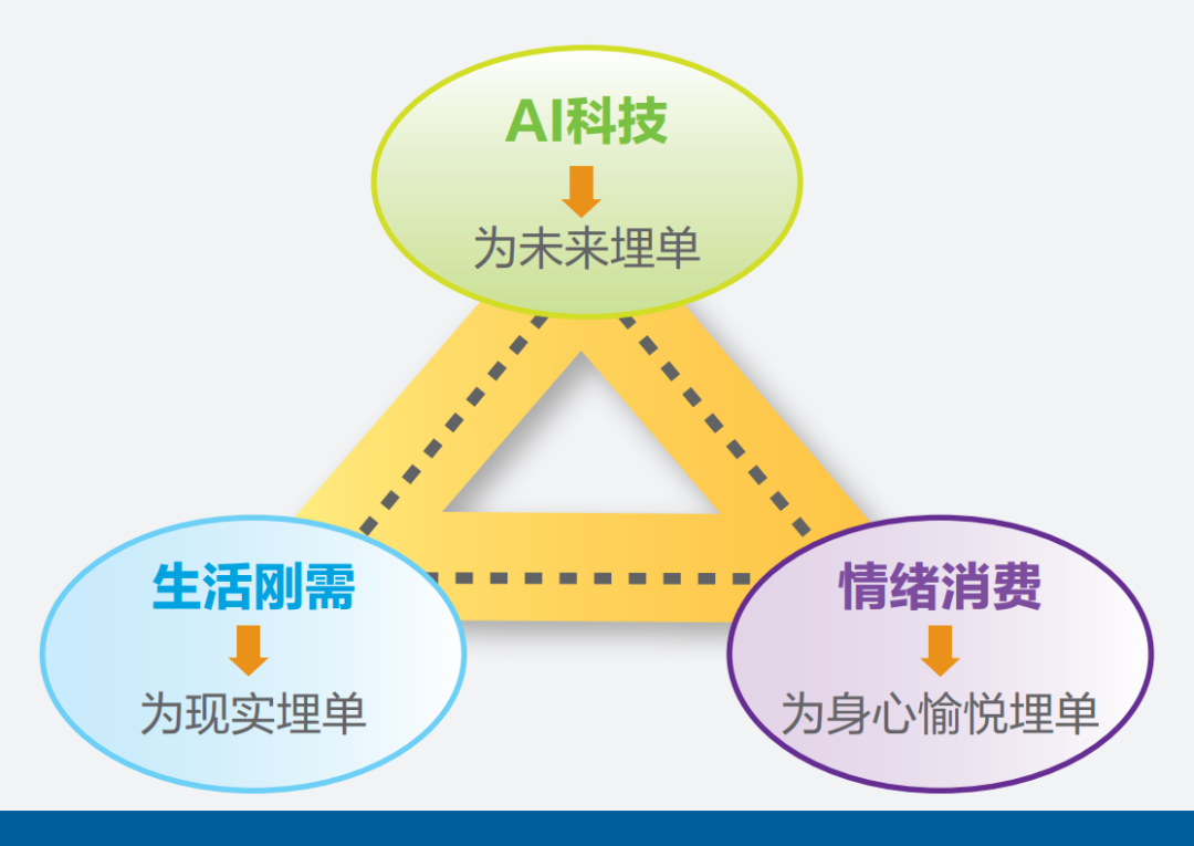AI科技是发展最快的赛道,为未来埋单;生活刚需指人们日常所需衣食住行教育等,大多是传统产业赛道,为现实埋单;情绪消费是异军突起的新赛道,为身心愉悦埋单。商业演变是从商品链接到信息链接,再到今天与客户的情绪链接的过程,随着传统消费向情绪消费转变,为情绪埋单的商业时代已经到来。