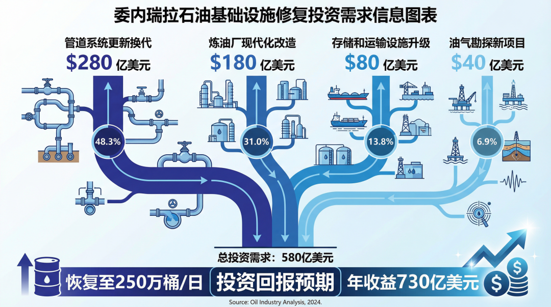 委内瑞拉石油基础设施修复投资需求分布图。580亿美元投资分配:管道系统更新换代280亿美元、炼油厂现代化改造180亿美元、存储和运输设施升级80亿美元、油气勘探新项目40亿美元。